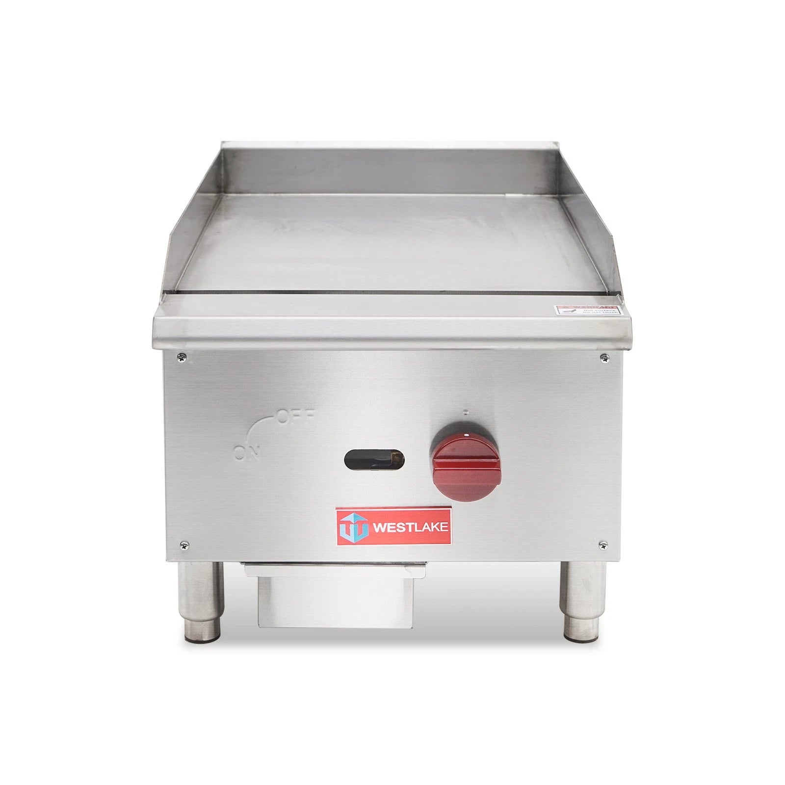 The West Lake EGG16S gas griddle offers a compact 15.9 inch griddle surface heated by a strong 30,000 Btu burner for even cooking and searing.
