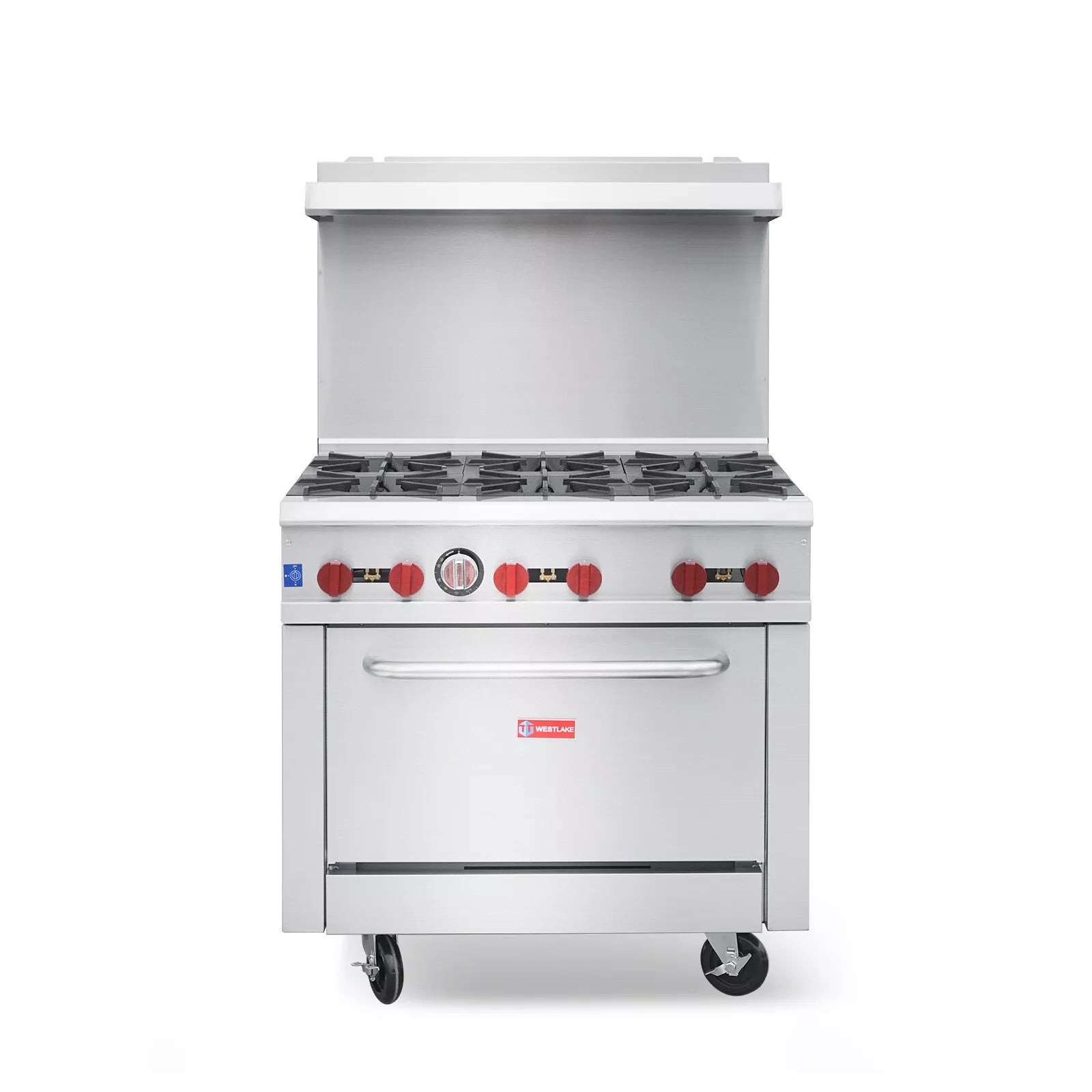 The West Lake RGR36 gas range with oven offers expanded cooktop surface and higher productivity for busy commercial kitchens. It provides powerful burner output with dependable oven baking.
